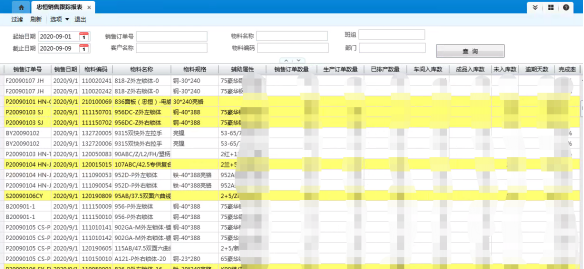 通過(guò)二開(kāi)報(bào)表的方式,增加了銷售訂單跟蹤表,通過(guò)該表可直觀看到銷售訂單的生產(chǎn)排產(chǎn)、入庫(kù)等情況,包括逾期未入庫(kù)時(shí)間等,并通過(guò)不同的顏色顯示,可直觀看到每個(gè)訂單的狀態(tài),更利于管理人員對(duì)訂單的跟蹤及管理。