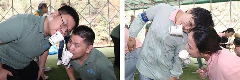 紙杯傳水、快樂加碼,在傳遞的過程中,有些伙伴心細配合很好,非常完美地將自己杯中的水全部傳遞給同伴,但也有伙伴沒有掌握規(guī)律,在傳遞的過程中被潑了一臉的水。